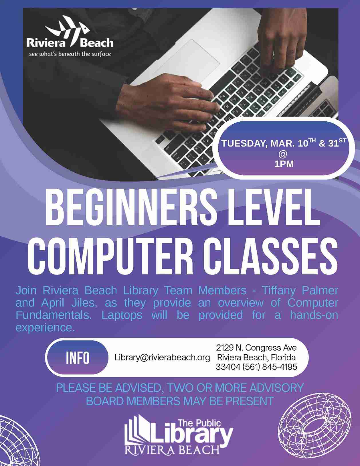 • Beginners Level Computer Classes:   Tuesday, March 10th and March 31st at 1pm