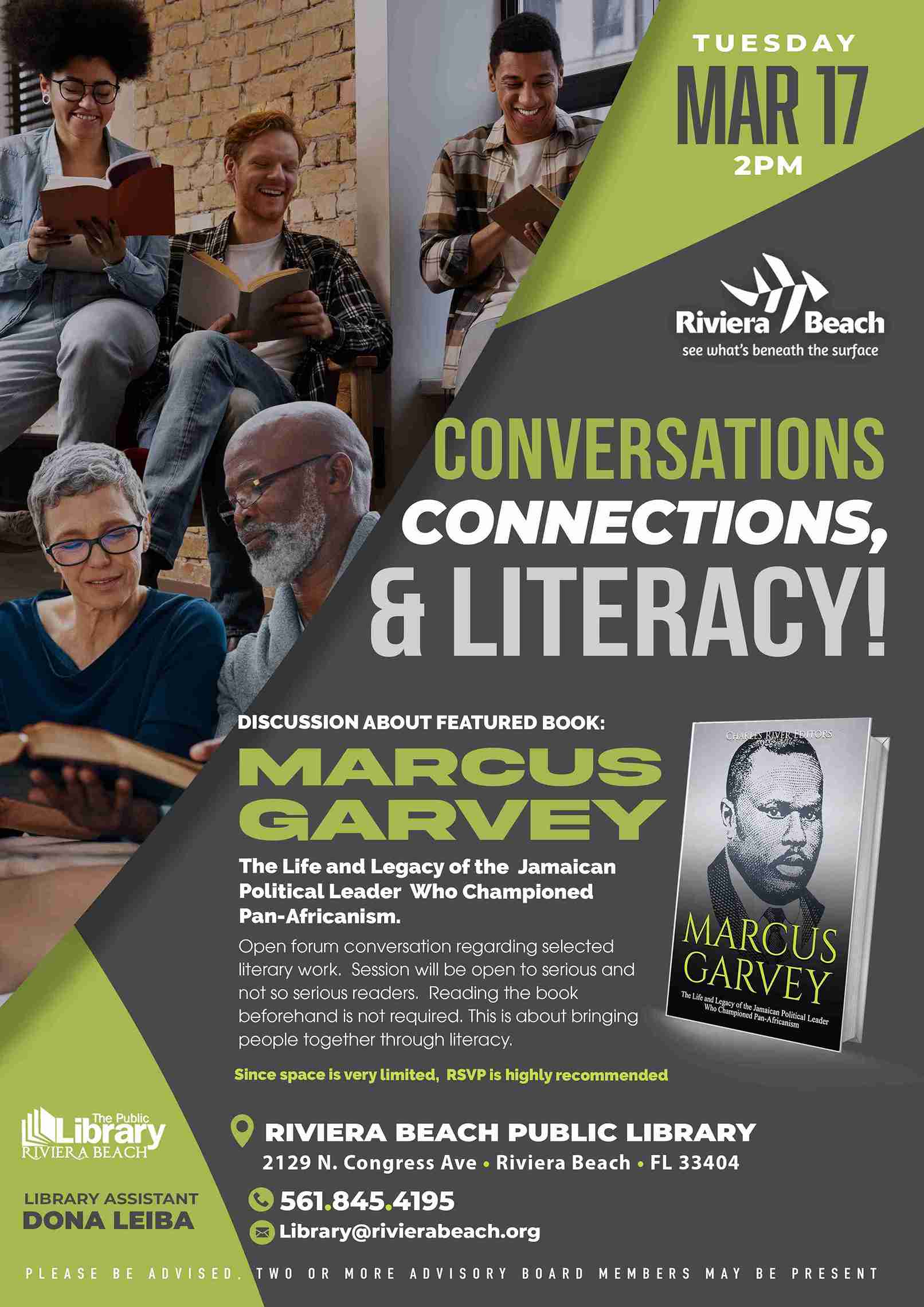 • Conversations, Connections, and Literacy – Featured Book, Marcus Garvey: The Life and Legacy of the Jamaican Political Leader Who Championed Pan-Africanism:   Tuesday, March 17th at 2pm