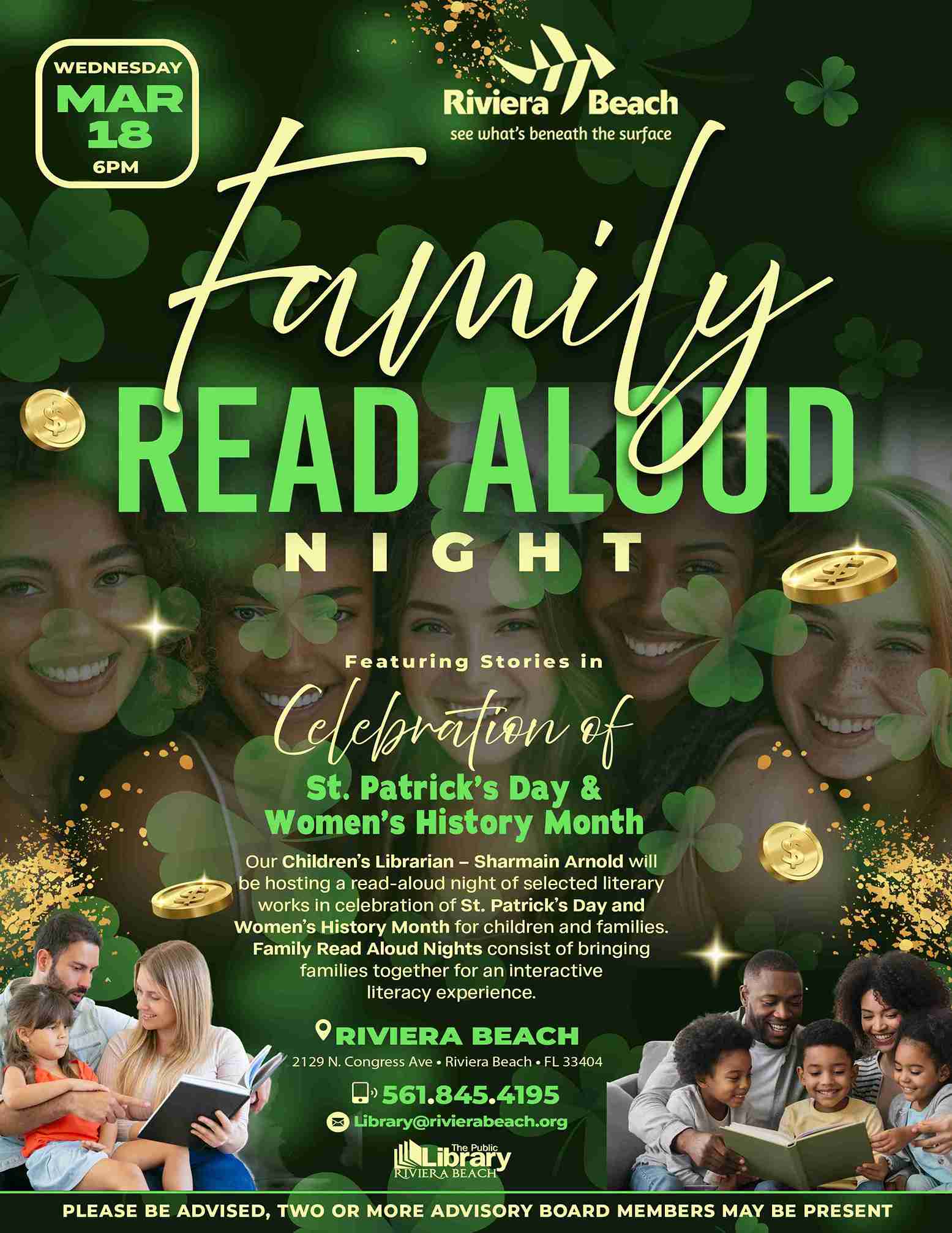 • Family Read Aloud Night – Stories In Celebration of Women’s History Month and St. Patrick’s Day:  Wednesday, March 18th at 6pm