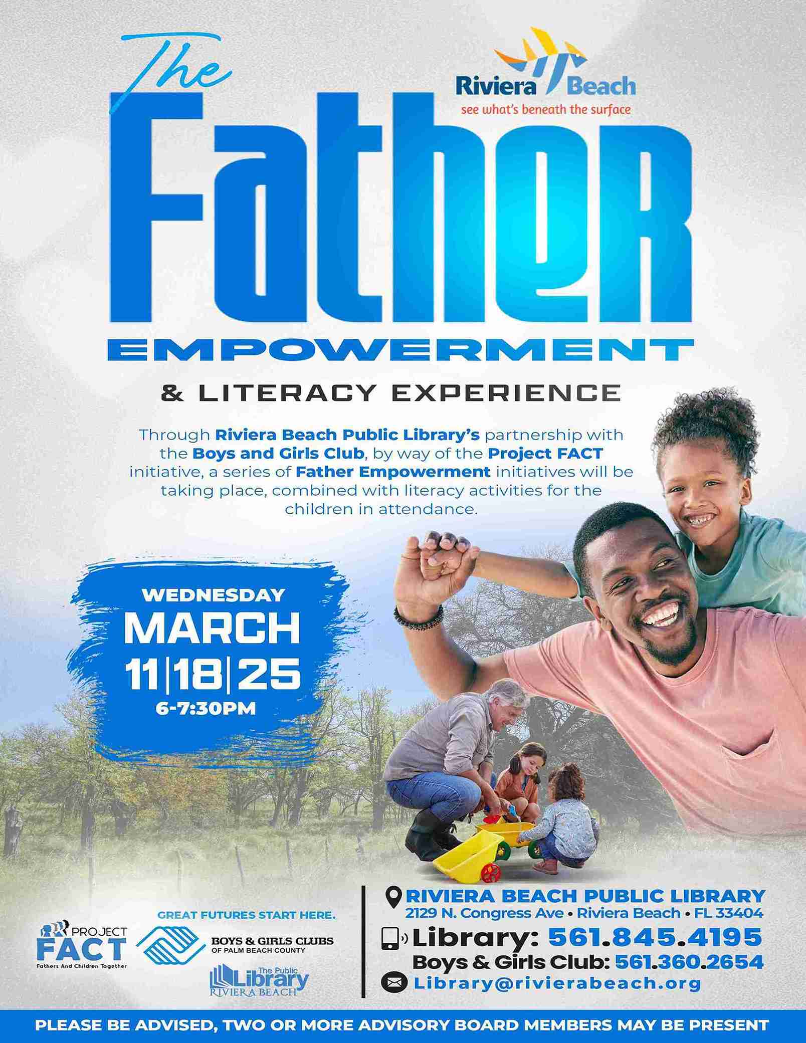 • Father Empowerment and Literacy Experience: Partnership With The Boys and Girls Club:  Wednesday, March 11th, March 18th, March 25th from 6pm – 7:30pm