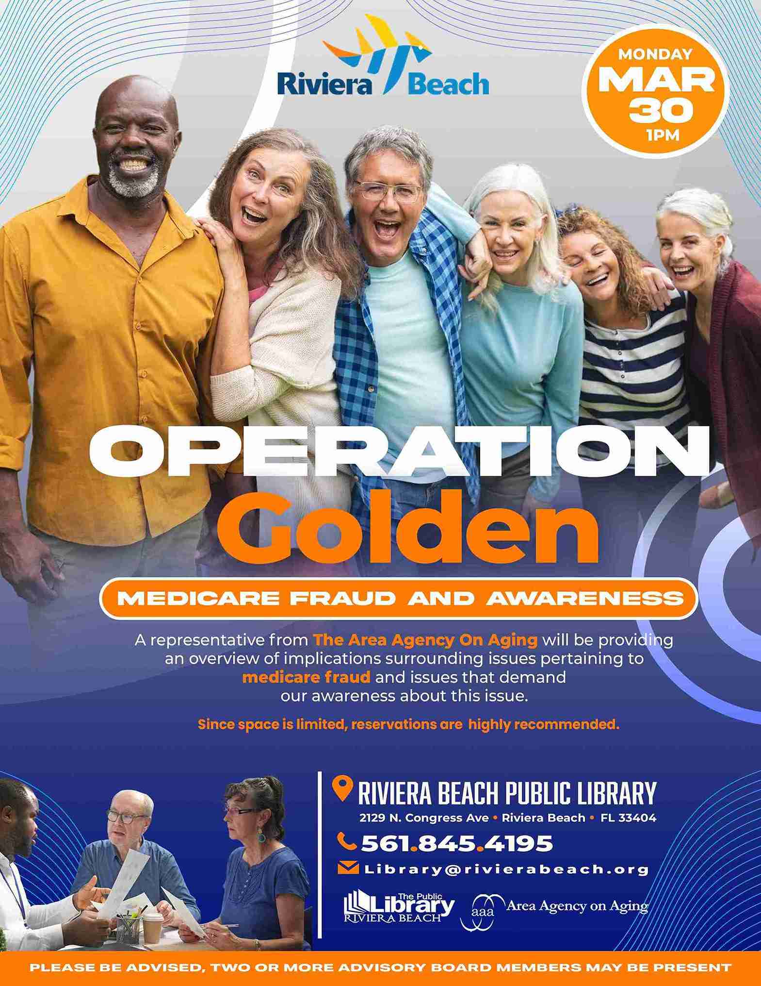 • Operation Golden – Presentation On Medicare Fraud And Awareness – Partnership With The Area Agency On Aging:  Wednesday, March 30th at 1pm