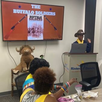 The Riviera Beach Public Library prides itself on being a Veteran Friendly library for the community. On back to back days, Riviera Beach Public Library’s Reference Leadership provided for our community innovative literacy initiatives in honor of the upcoming Veterans Day Holiday. On Tuesday, November 4th, our Adult Librarian – Ms. April Jiles rendered a spinoff version of our signature literacy initiative – “Conversations, Connections, and Literacy – The Veterans Edition.” During the course of the initiative, Ms. Jiles featured the book titled, “Buffalo Soldiers.” This involved an extensive presentation and thought provoking discussion for all who attended. Much like our regular editions of our signature adult literacy initiative, it’s not about whether one has read the book or not. It’s about taking concepts from the book and channeling them for a more robust discussion. It’s about bringing the community together through the realms of literacy.