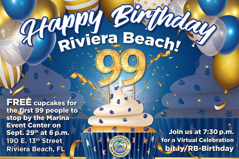 The City of Riviera Beach turns 99 tomorrow, Sept. 29. Help us celebrate at the Marina Event Center! Free cupcakes for the first 99 partygoers who stop by the Event Center You can also join the festivities at home by watching our Zoom broadcast. https://us02web.zoom.us/j/87221378956#success