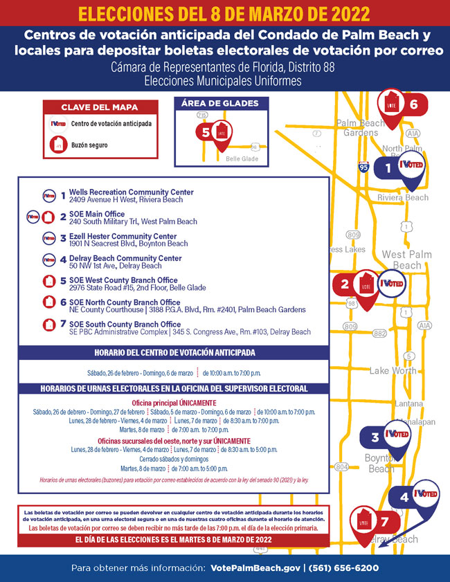 REQUEST IT Visit VotePalmBeach.gov, call (561) 656-6208, or email votebymail@votepalmbeach.gov Deadline to request a Vote-by-Mail ballot to be mailed to you is 5:00 p.m. on Saturday, February 26, 2022. A mail ballot can be requested in person until 5:00 p.m. on March 7, 2022. Please have your Driver License, Florida ID card, or the last 4 digits of your Social Security number available when making your request. RETURN IT Mail your Vote-by-Mail ballot using pre-paid postage, or drop it off inside any of our four offices during business hours. You may also drop it off at designated drop off locations across the county starting February 26, 2022. TRACK IT Visit the “My Status” page at VotePalmBeach.gov **Your ballot must be received at the Main Elections Office by 7:00 p.m. on Election Day, March 8, 2022. **