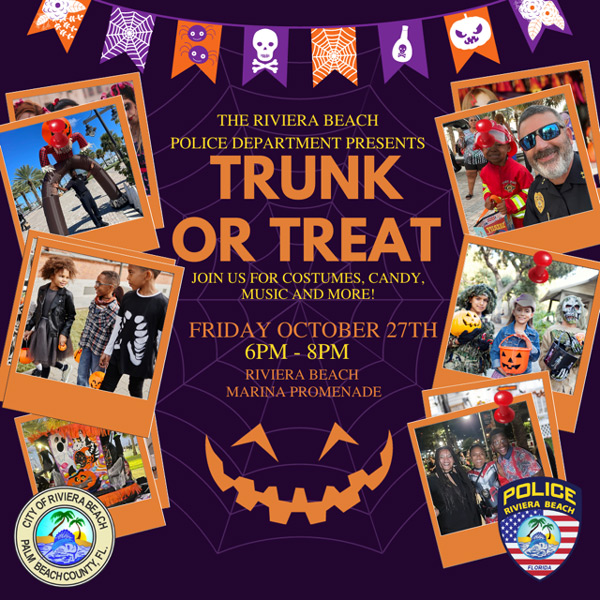THE RIVIERA BEACH POLICE DEPARTMENT PRESENTS TRUNK OR TREAT JOIN US FOR COSTUMES, CANDY, MUSIC AND MORE! FRIDAY OCTOBER 27TH 6PM - 8PM RIVIERA BEACH MARINA PROMENADE
