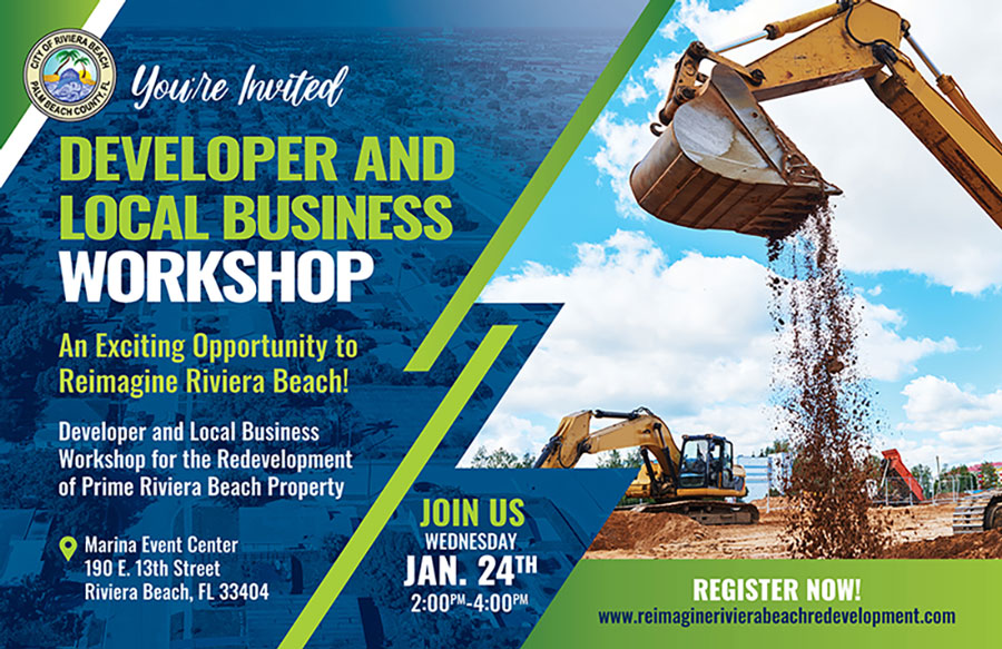 Youre morted DEVELOPER AND LOCAL BUSINESS WORKSHOP An Exciting Opportunity to Reimagine Riviera Beach! Developer and Local Business Workshop for the Redevelopment of Prime Riviera Beach Property o Marina Event Center 190 E. 13th Street Riviera Beach, FL 33404 JOIN US WEDNESDAY JAN. 24TH 2:00PM-4:00PM REGISTER NOW! www.reimaginerivierabeachredevelopment.com