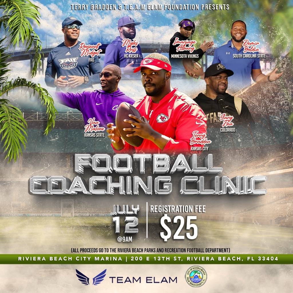 TERRY BRADDEN & 1.L.A.M ELAM FOUNDATION PRESENTS Doogevell Midget FAU lyles ???? HO KIESER A MINNESOTA VIKINGS Demin Boldin SOUTH CAROLINA STHIE TA Dang Hea COLORADO= KANSAS STATE Terry Soadden KANSAS CITY FOOTBALL EDACHING CLINIC REGISTRATION FEE 12 @9AM $25 CALL PROCEEDS GO TO THE RIVIERA BEACH PARKS AND RECREATION FOOTBALL DEPARTMENT) RIVIERA BEACH CITY MARINA | 200 E 13TH ST, RIVIERA BEACH, FL 33404