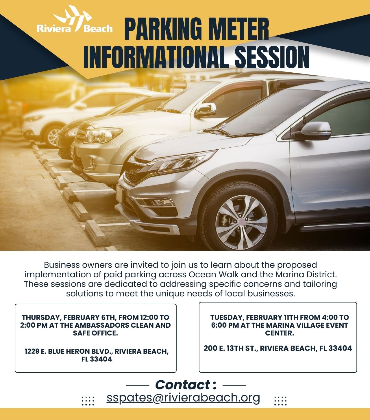 PARKING METER INFORMATIONAL SESSION Business owners are invited to join us to learn about the proposed implementation of paid parking across Ocean Walk and the Marina District. These sessions are dedicated to addressing specific concerns and tailoring solutions to meet the unique needs of local businesses. THURSDAY, FEBRUARY 6TH, FROM 12:00 TO 2:00 PM AT THE AMBASSADORS CLEAN AND SAFE OFFICE. TUESDAY, FEBRUARY 11TH FROM 4:00 TO 6:00 PM AT THE MARINA VILLAGE EVENT CENTER. 1229 E. BLUE HERON BLVD., RIVIERA BEACH, FL 33404 200 E. 13TH ST., RIVIERA BEACH, FL 33404 ::: Contact: sspates@rivierabeach.org