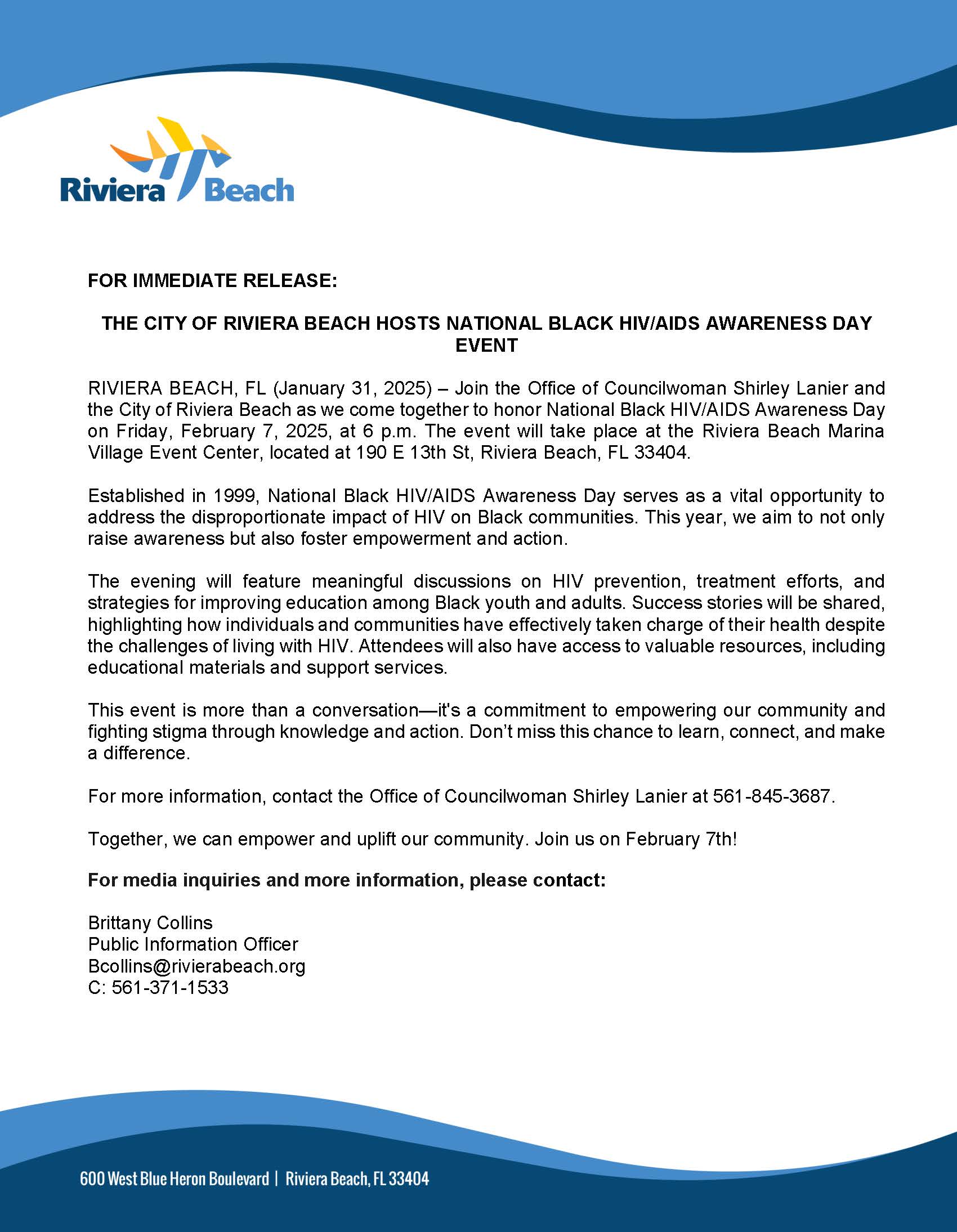 FOR IMMEDIATE RELEASE: THE CITY OF RIVIERA BEACH HOSTS NATIONAL BLACK HIV/AIDS AWARENESS DAY EVENT RIVIERA BEACH, FL (January 31, 2025) – Join the Office of Councilwoman Shirley Lanier and the City of Riviera Beach as we come together to honor National Black HIV/AIDS Awareness Day on Friday, February 7, 2025, at 6 p.m. The event will take place at the Riviera Beach Marina Village Event Center, located at 190 E 13th St, Riviera Beach, FL 33404. Established in 1999, National Black HIV/AIDS Awareness Day serves as a vital opportunity to address the disproportionate impact of HIV on Black communities. This year, we aim to not only raise awareness but also foster empowerment and action. The evening will feature meaningful discussions on HIV prevention, treatment efforts, and strategies for improving education among Black youth and adults. Success stories will be shared, highlighting how individuals and communities have effectively taken charge of their health despite the challenges of living with HIV. Attendees will also have access to valuable resources, including educational materials and support services. This event is more than a conversation—it's a commitment to empowering our community and fighting stigma through knowledge and action. Don’t miss this chance to learn, connect, and make a difference. For more information, contact the Office of Councilwoman Shirley Lanier at 561-845-3687. Together, we can empower and uplift our community. Join us on February 7th! For media inquiries and more information, please contact: Brittany Collins Public Information Officer Bcollins@rivierabeach.org C: 561-371-1533