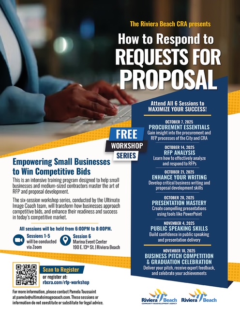 Want to learn how to win more contracts and stand out in competitive bids? The Riviera Beach CRA is hosting a FREE 6-part workshop series: How to Respond to Requests for Proposals (RFPs).