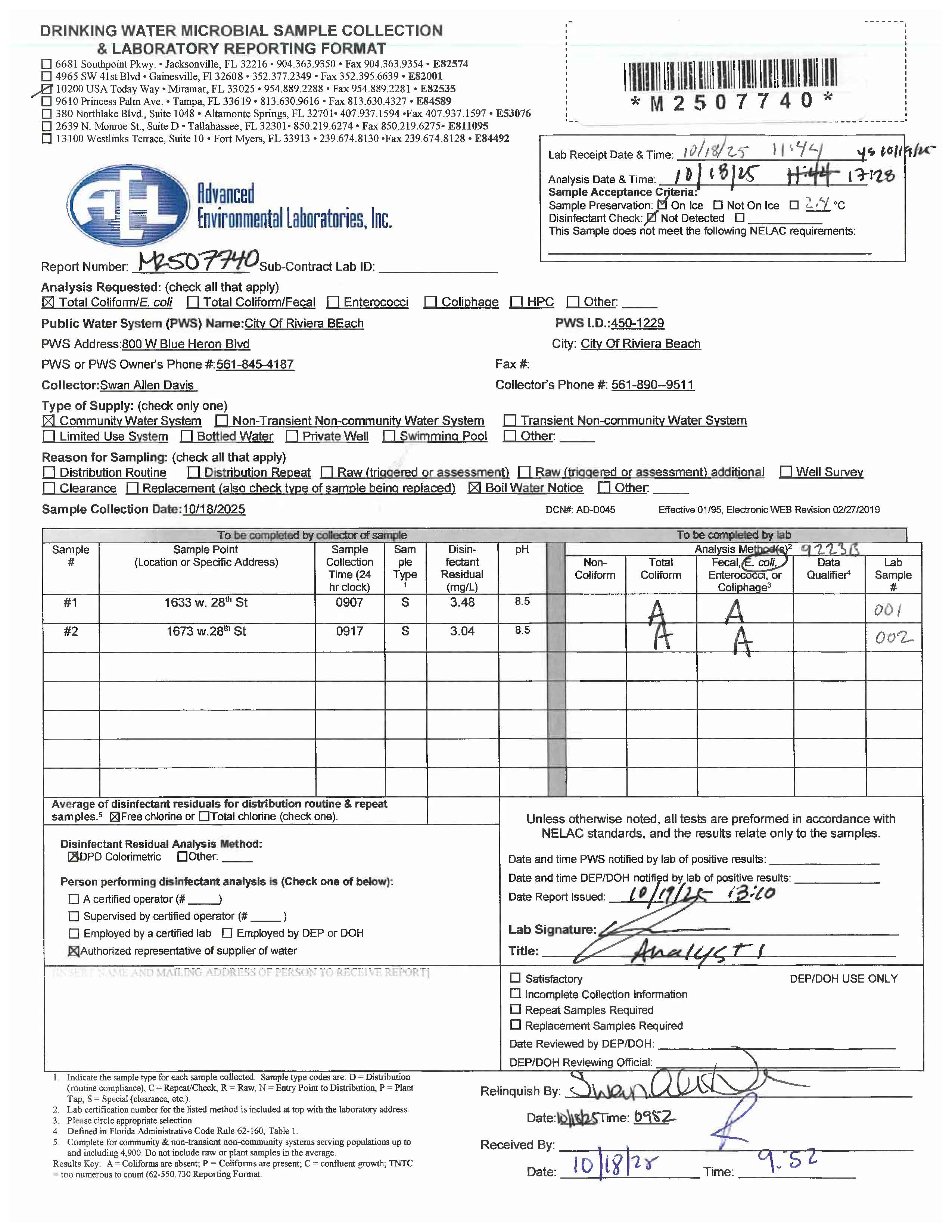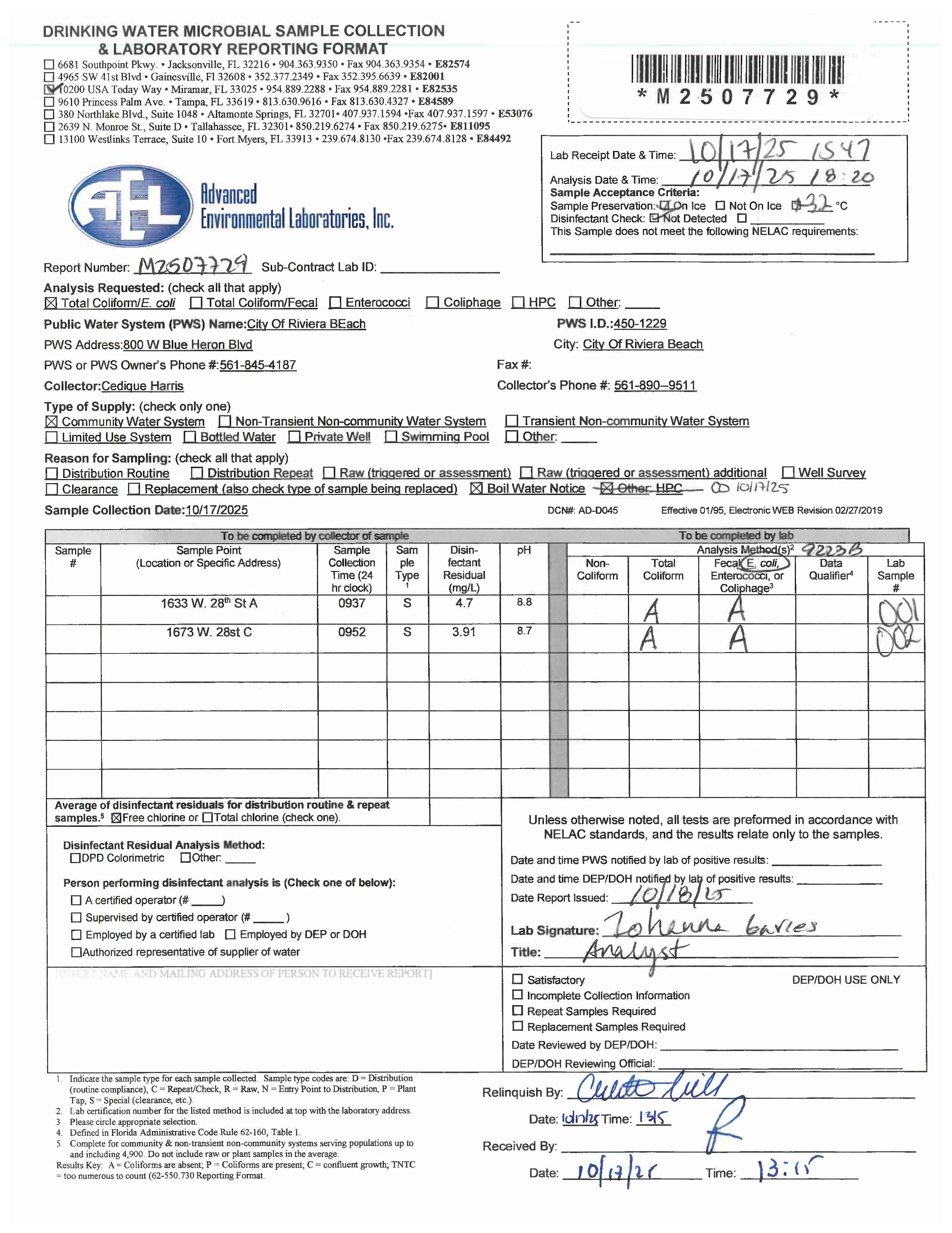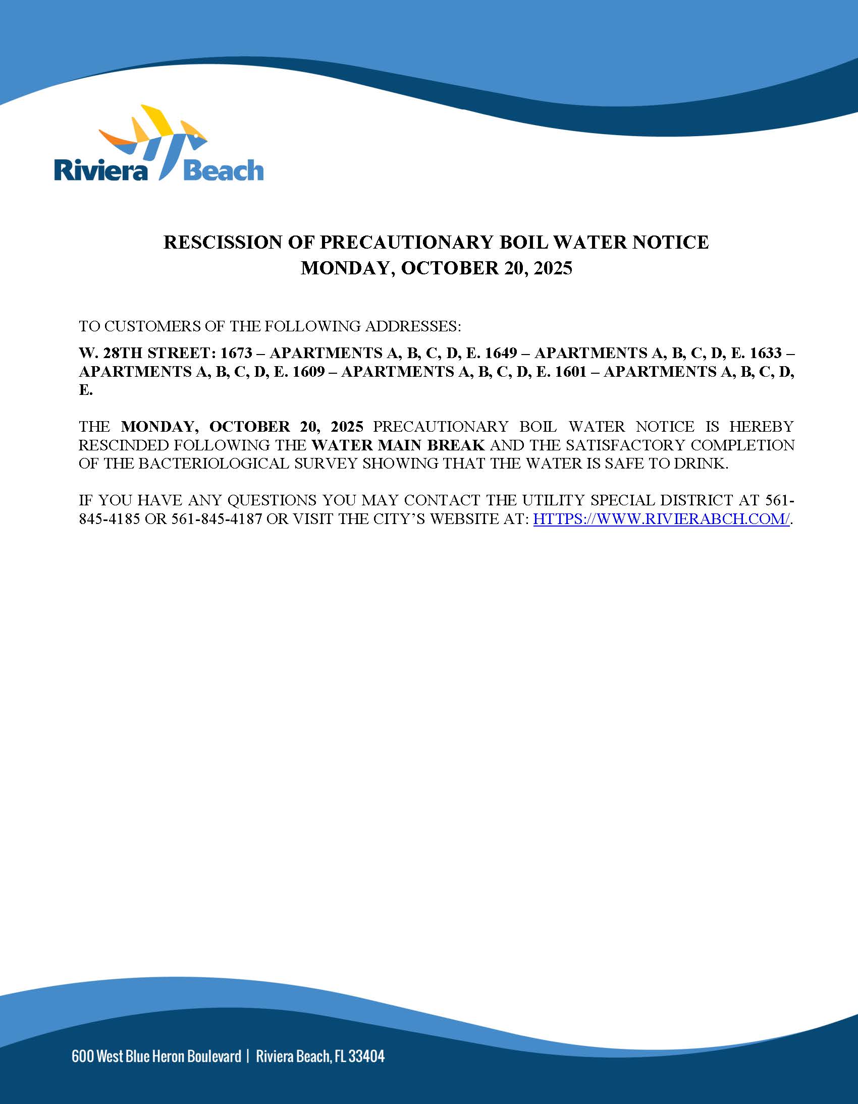 The precautionary boil water notice issued on October 20, 2025, has been rescinded for the following addresses: