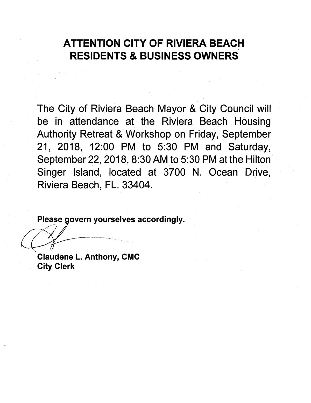 9/20/2018 - The City of Riviera Beach Mayor & City Council will be in attendance at the Riviera Beach Housing Authority Retreat & Workshop on Friday, September 21, 2018, 12:00 PM to 5:30 PM and Saturday, September 22, 2018, 8:30 AM to 5:30 pm