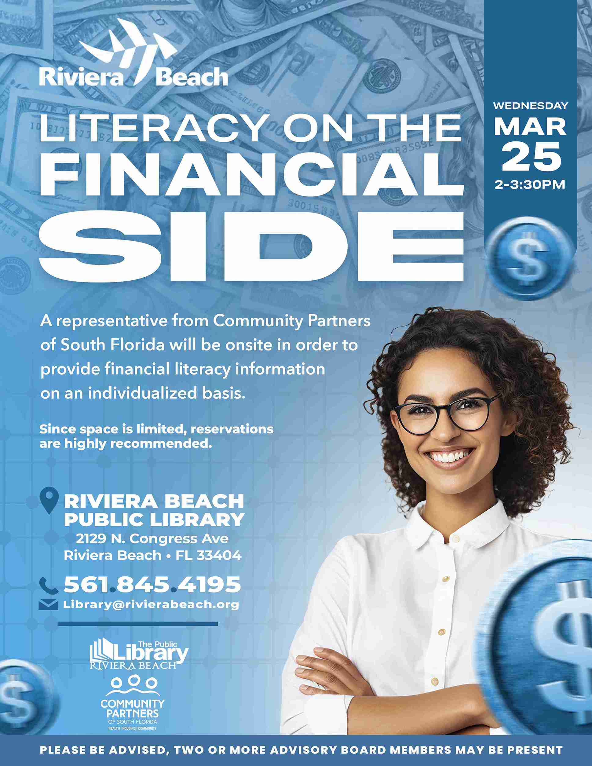 • Literacy On The Financial Side – Partnership With Community Partners of South Florida:  Wednesday, March 25th from 2pm – 3:30pm
