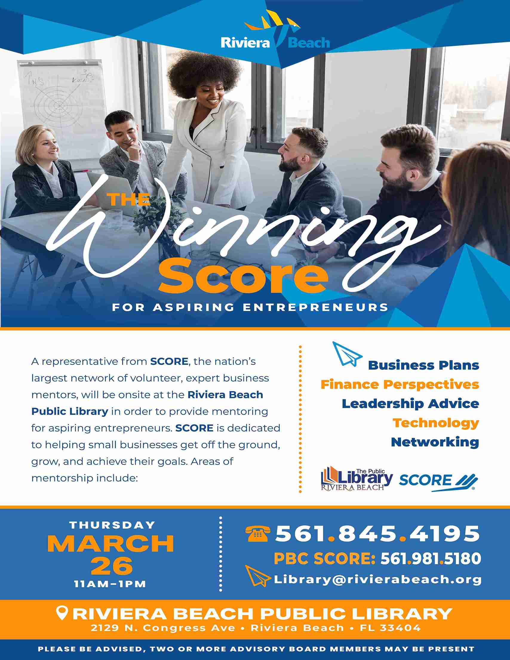 • Winning SCORE For Aspiring Entrepreneurs – Partnership With SCORE: Thursday, March 26th at 11am-1pm
